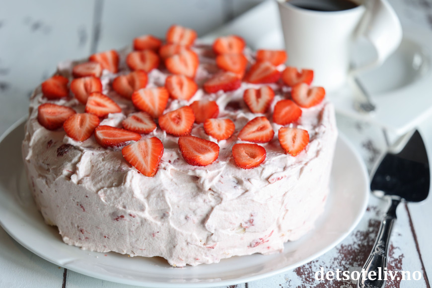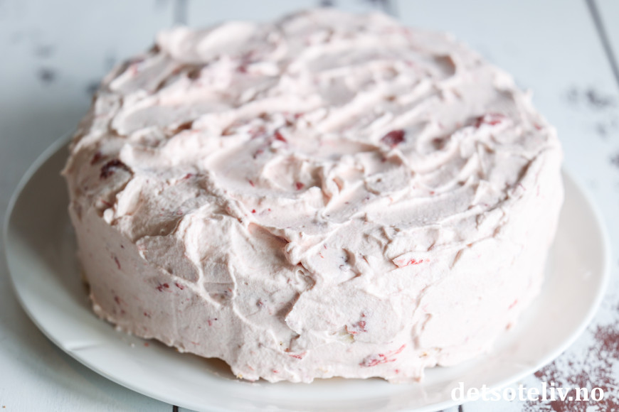 ♥ Kaken bør fylles og dekkes med jordbærkrem og friske jordbær på serveringsdagen, slik at krem og jordbær er helt ferske.