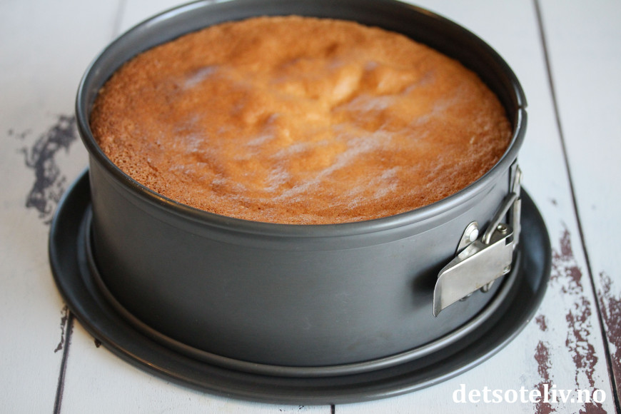 Ha deigen i en rund kakeform (24 cm i diameter) med bakepapir i bunnen.