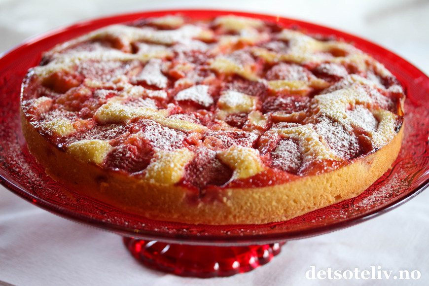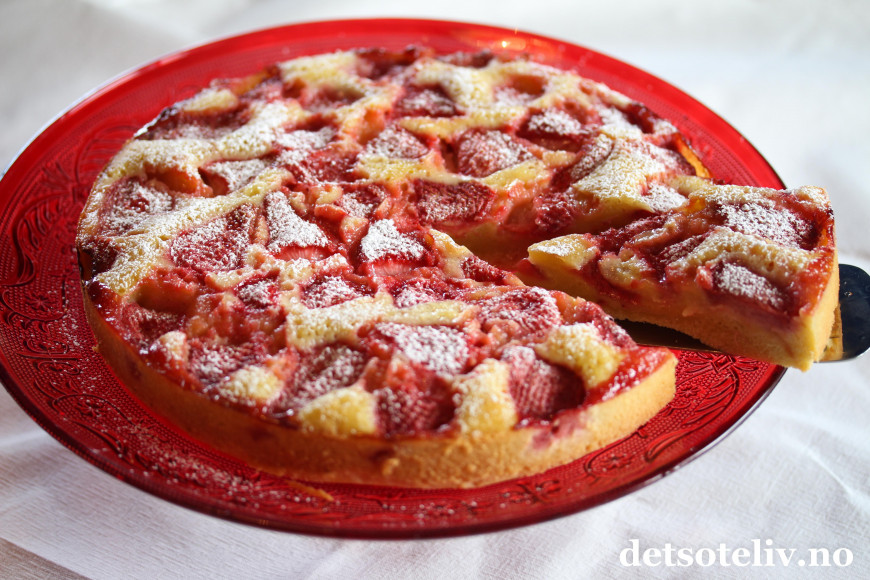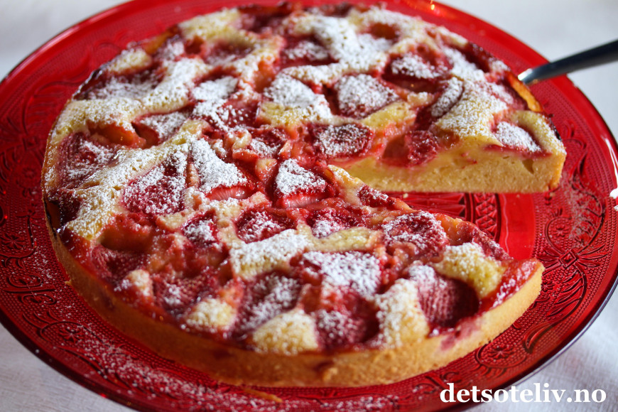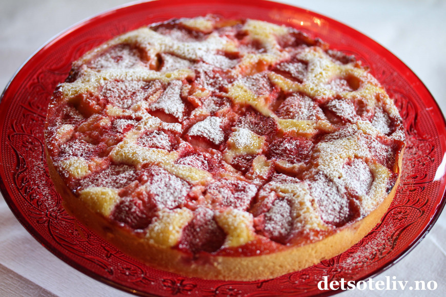 Ha deigen i en rund form (24 cm i diameter) med bakepapir i bunnen. Del jordbærene på midten og legg dem utover deigen med snittsiden vendende nedover.