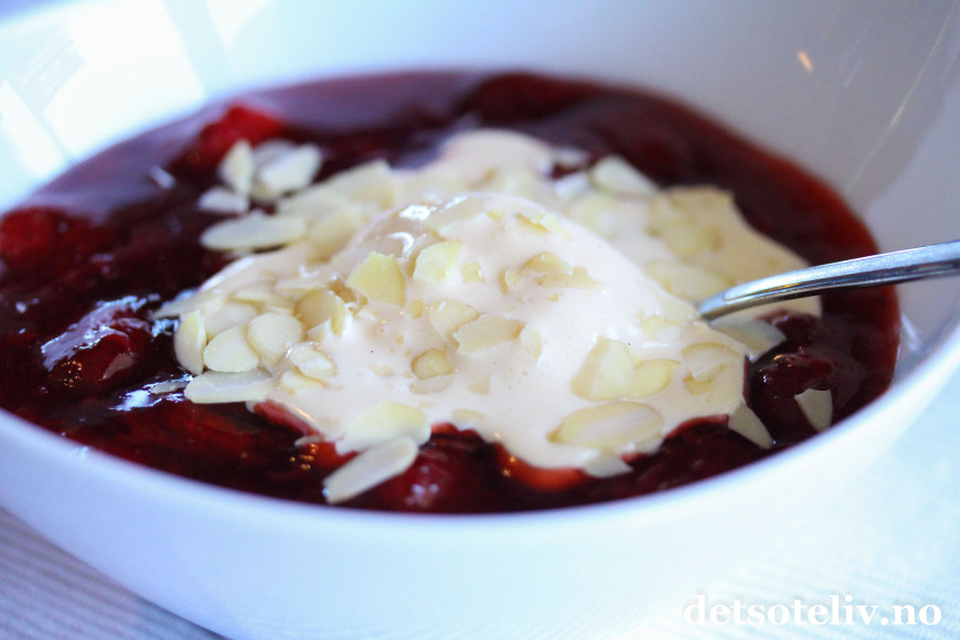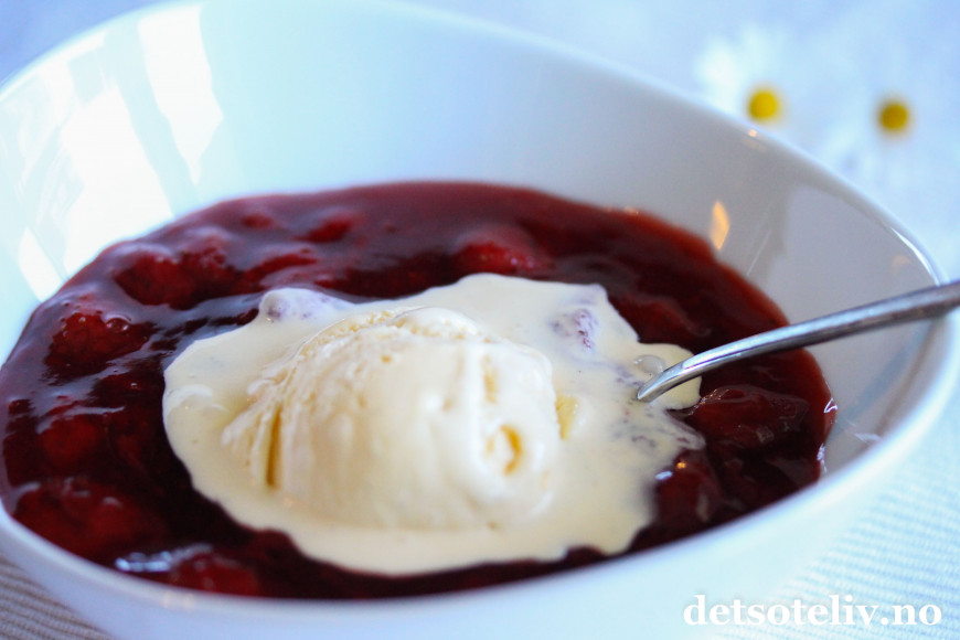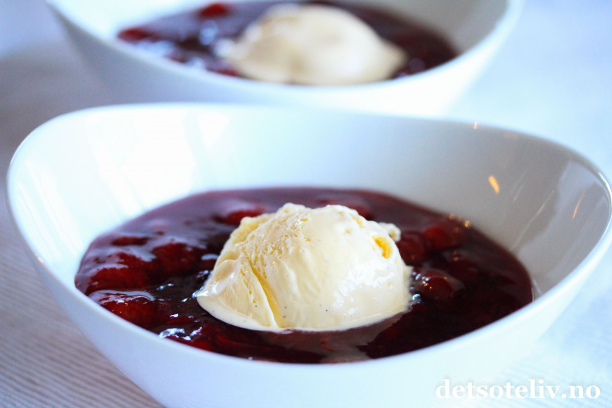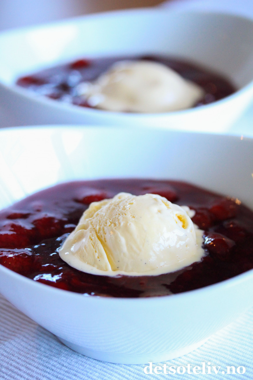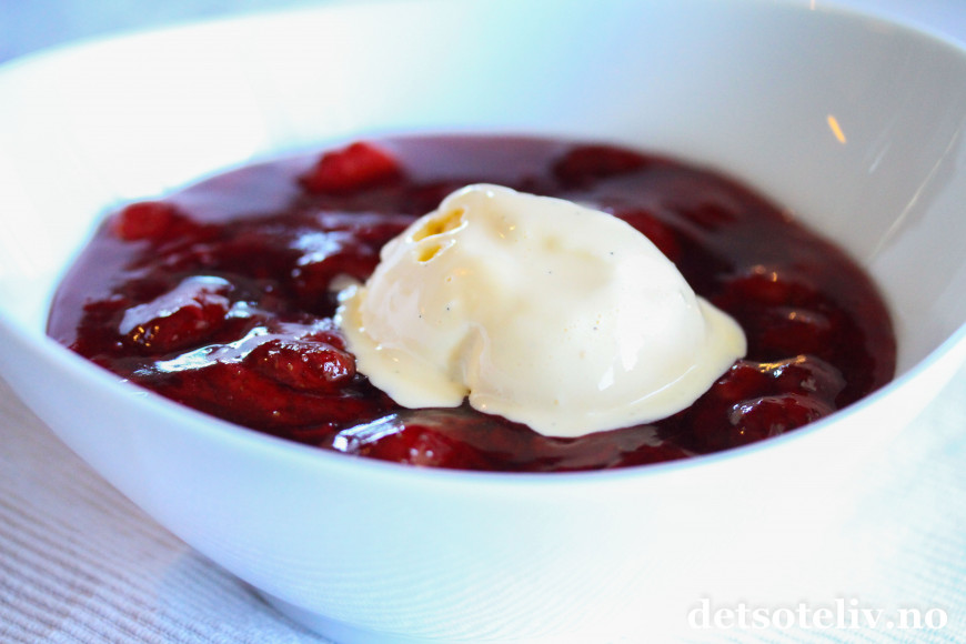 Og så liker jeg godt at jordbærkompotten er litt lunken slik at vaniljeisen smelter...