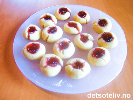 Form runde kuler av deigen og legg dem på bakepapirkledd stekeplate (20 stk fordelt på 2 plater). Trykk de litt flate og lag en fordypning i hver kake (bruk lillefinger, baksiden på en sleiv el.). Bruk to teskjeer og fyll fordypningene med litt jordbærsyltetøy.