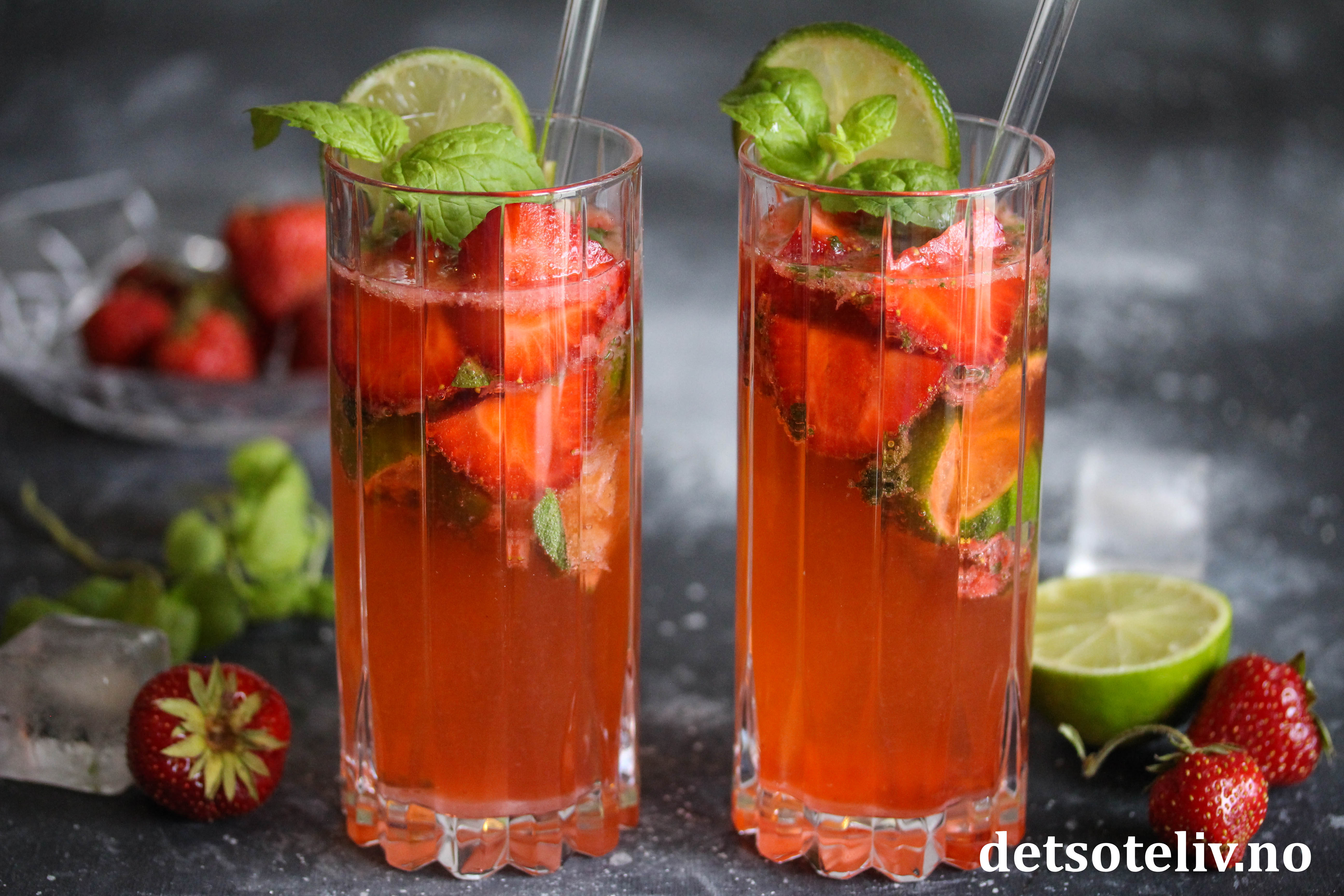 Ha til slutt noen ekstra jordbærbiter i glasset og pynt med mynteblader og en skive lime.