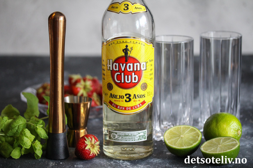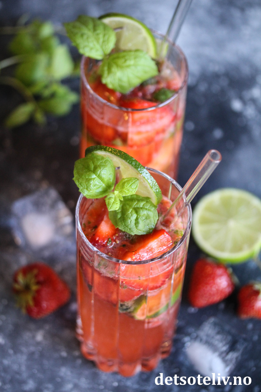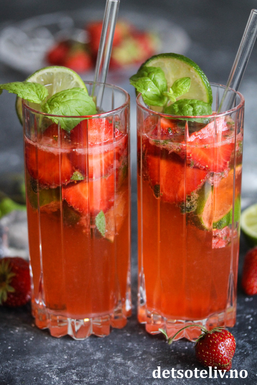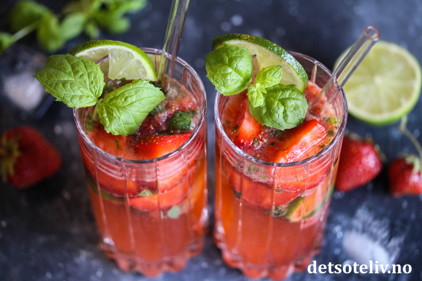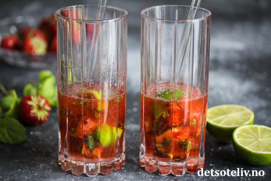 Dette er den klassiske drinken Mojito med mynte, rom og lime, som i tillegg er tilsatt moste jordbær. Se også Bringebærmojito og Limoncello Mojito.