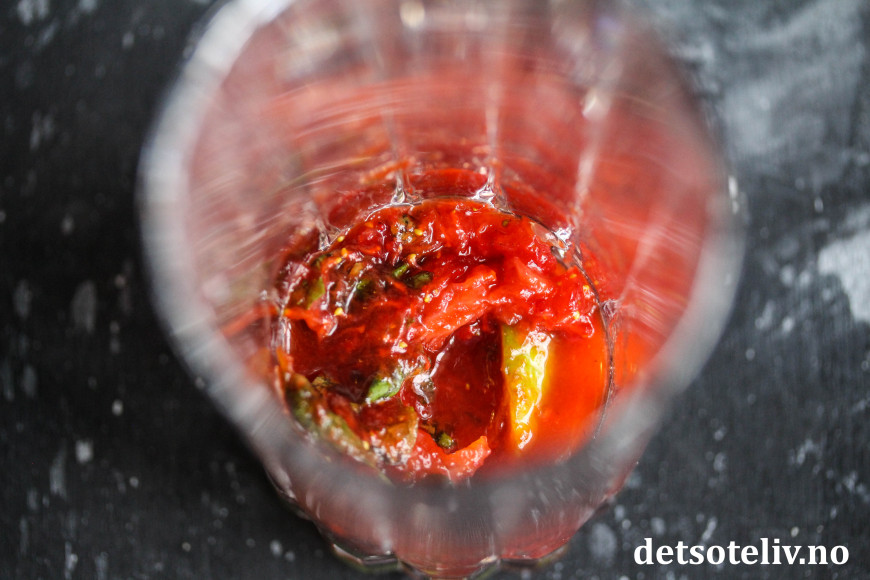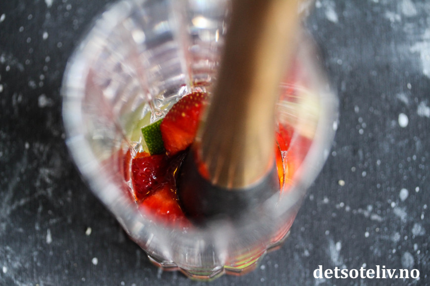 ♥ Jeg moser jordbær, lime og sukker sammen først til saftene blander seg godt og sukkeret løser seg opp. Jeg tilsetter myntebladene etterpå slik at de ikke skal bli helt moste.