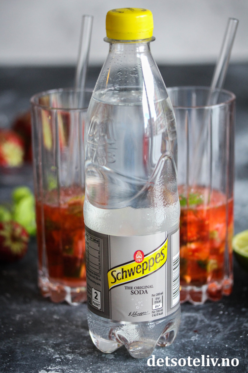 Ha så i sodavann og isbiter. Rør raskt rundt.