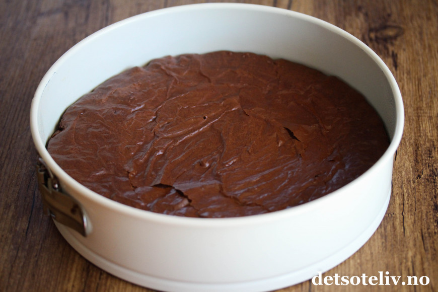 Ha deigen i en rund form (26 cm i diameter) med bakepapir i bunnen.