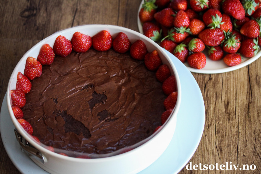 ♥ Det er viktig at du lar browniekaken bli helt kald og fast før du tar den ut av formen, ellers vil den lett gå i stykker. Vil du være helt sikker, kan du la browniekaken stå i kjøleskapet over natten før du forsetter med å lage jordbærmoussen dagen etter. Kaken er da klar til servering dagen etter der igjen.