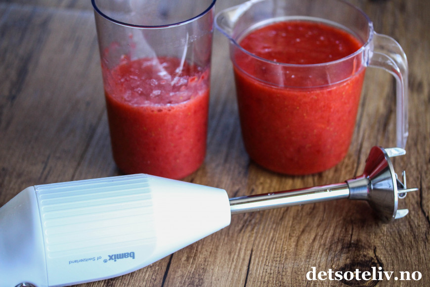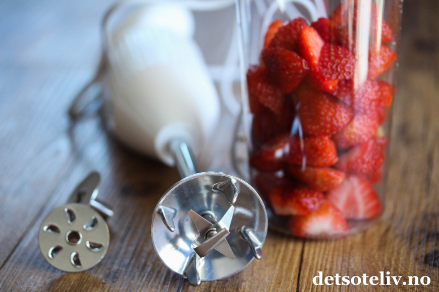 Rens jordbærene. Del dem i biter og mos dem med en stavmikser.