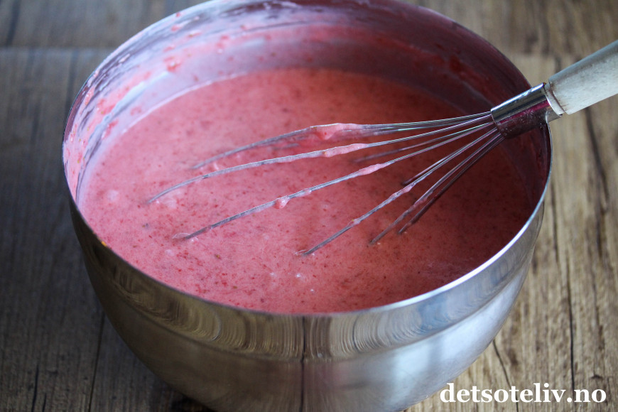♥ For å unngå gelatintråder i jordbærmoussen, lønner det seg først å ha litt av jordbærmosen (ca 2 dl) i den flytende jordbærgeléen. Rør godt og ha så dette i bollen med resten av jordbærmosen.