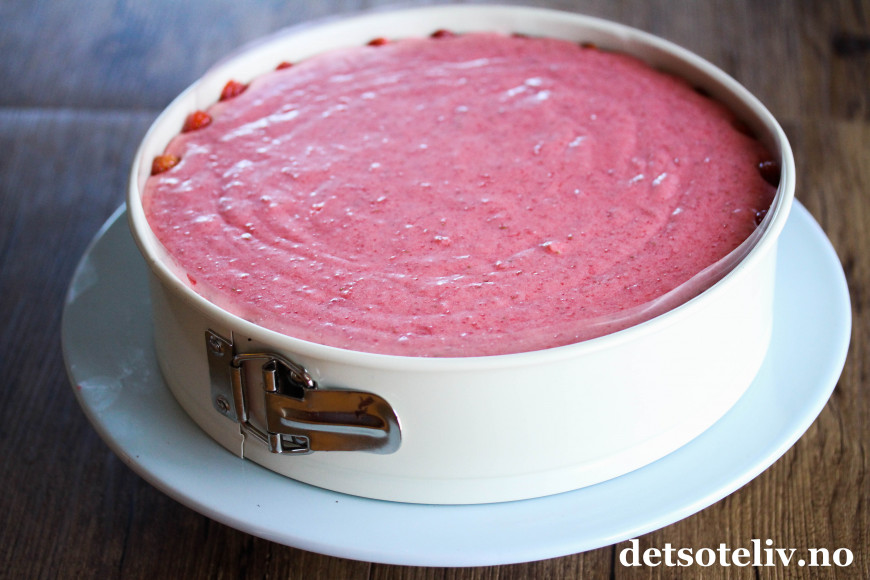 Jordbærmoussen er laget med friske, kaldmoste jordbær som gir ekstra god og ekte jordbærsmak på kaken.