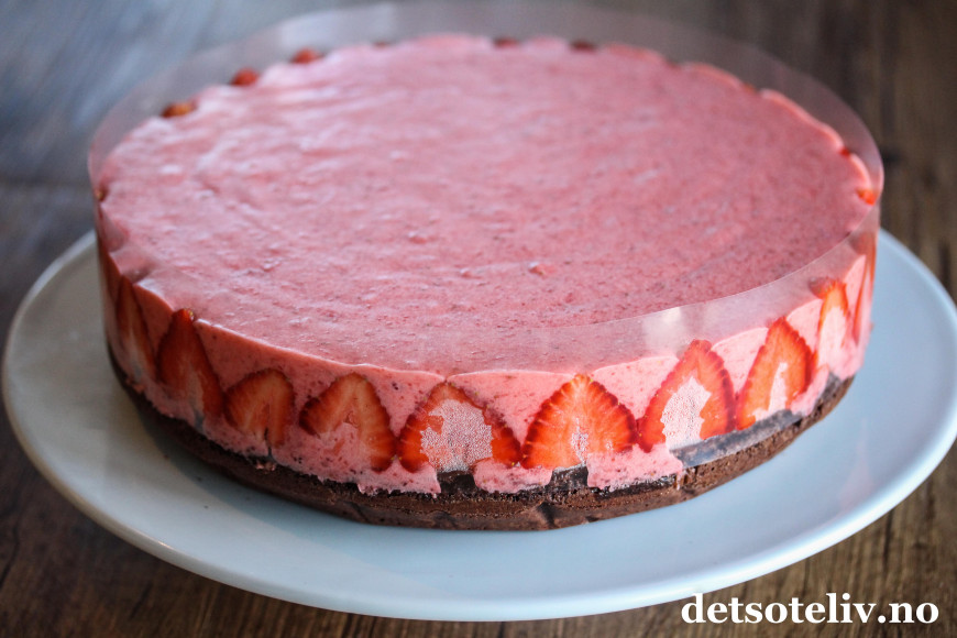 Hell den så forsiktig over browniebunnen og sett fatet med kaken i kjøleskapet til jordbærmoussen har stivnet. Det tar minst 4 timer, men la gjerne kaken stå i kjøleskapet over natten.