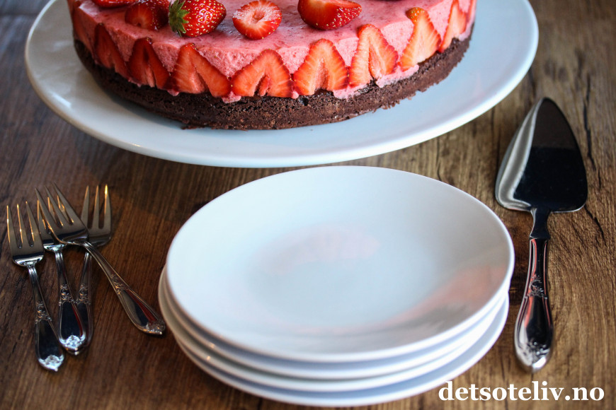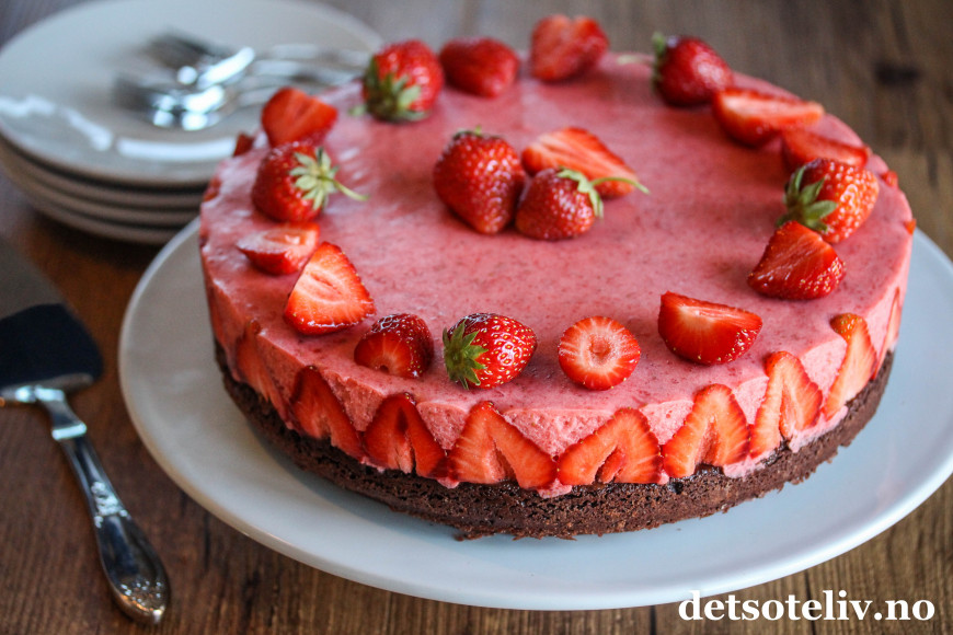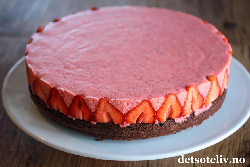 Jeg har laget lignende kake før (se Jordbærmoussekake på browniebunn og Jordbærmoussekake på sjokoladebunn).