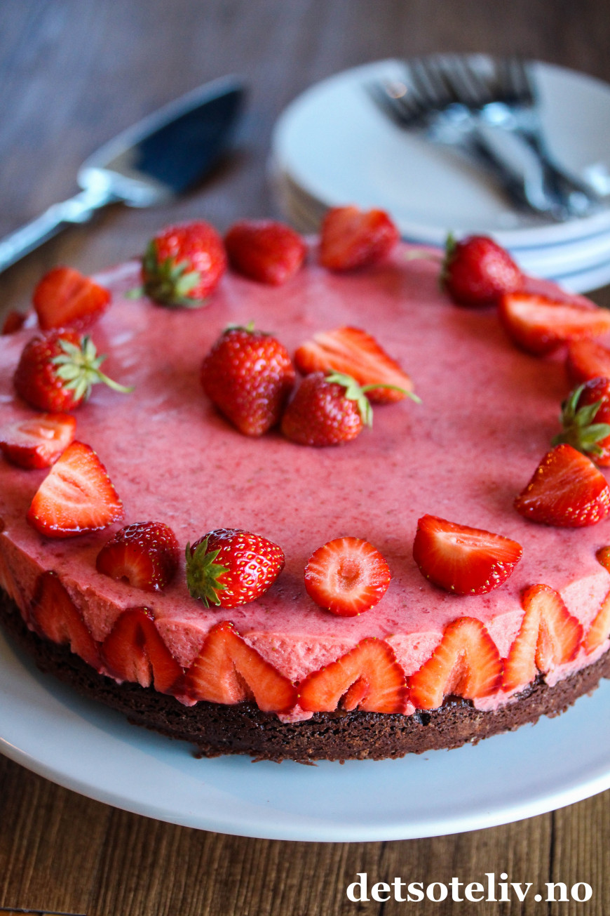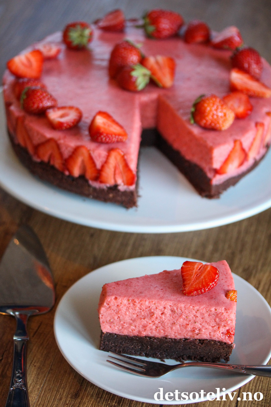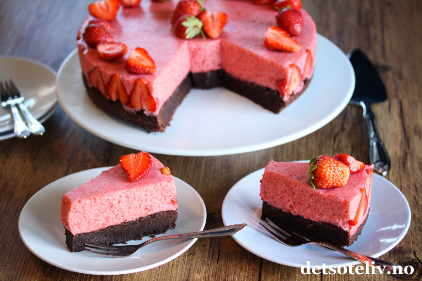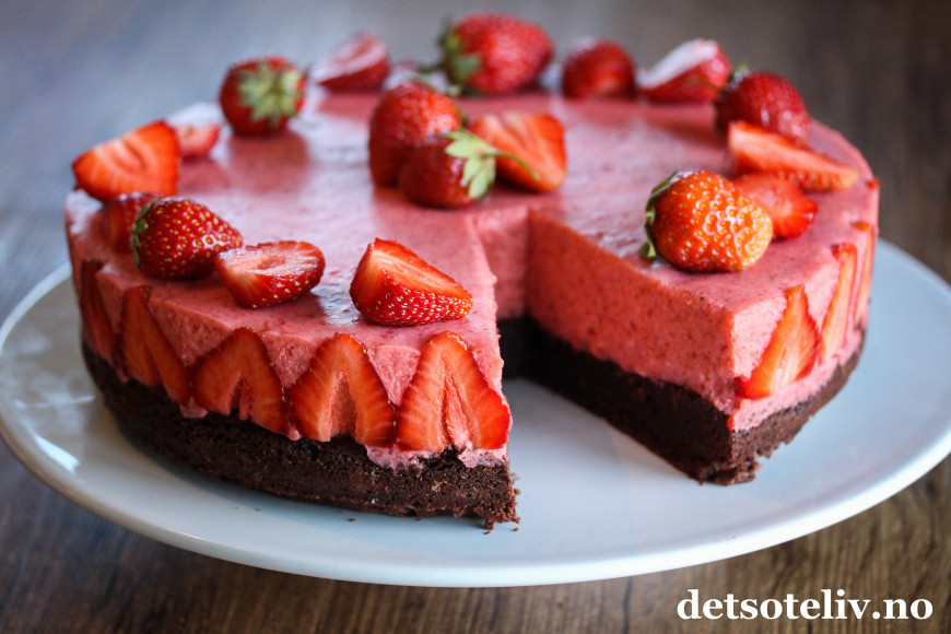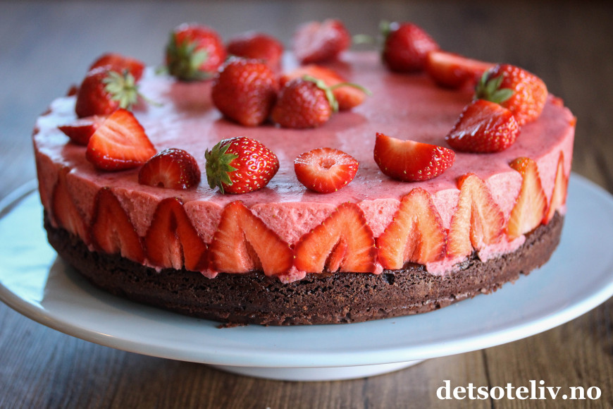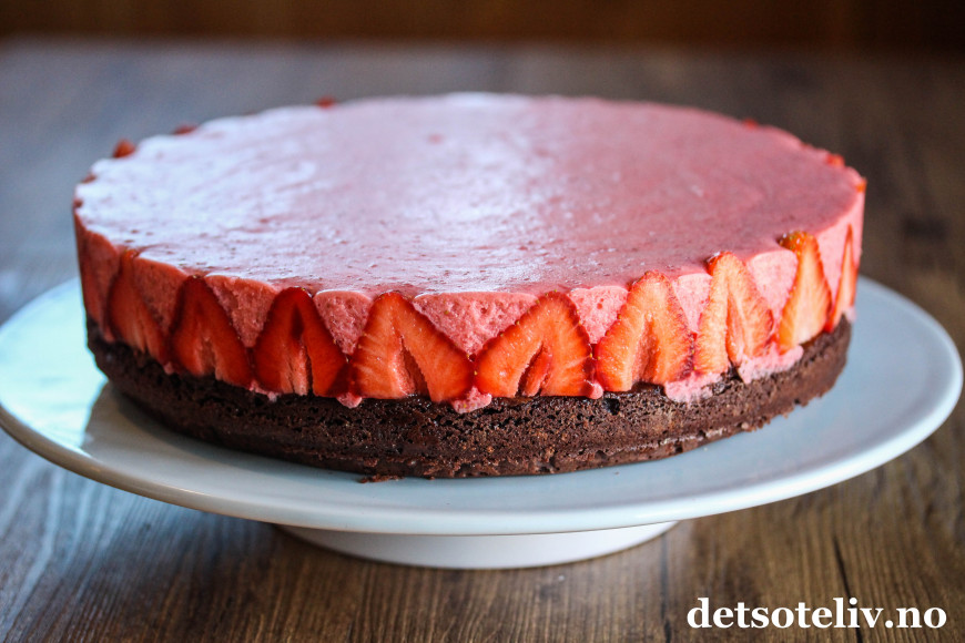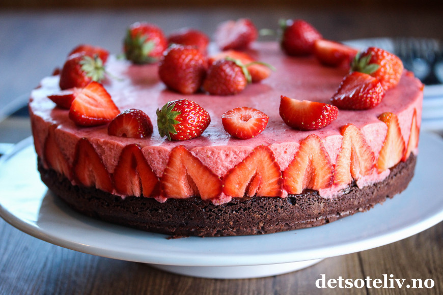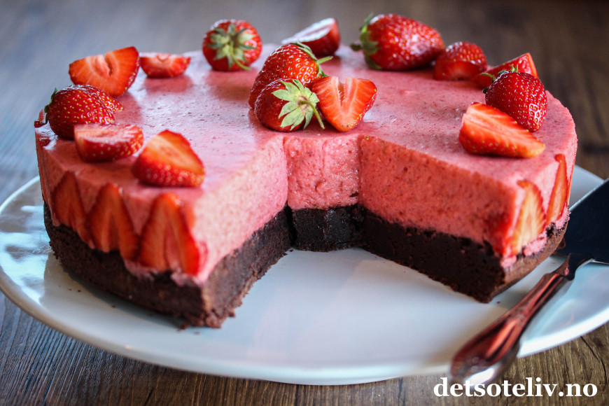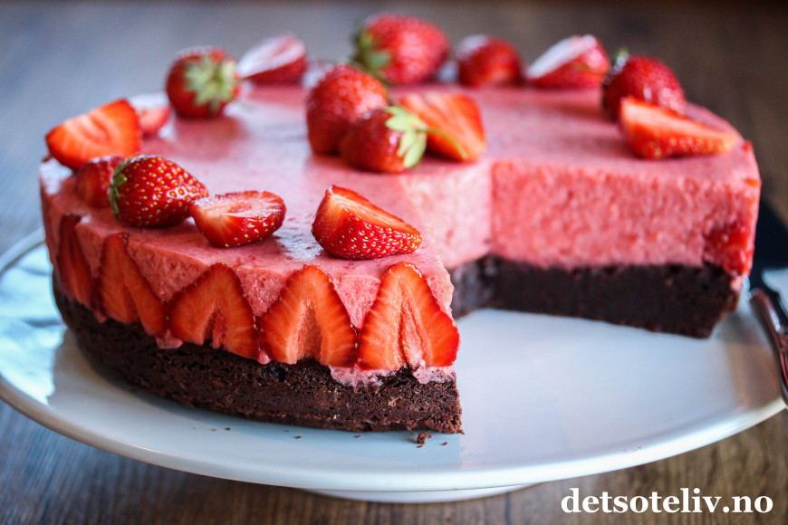 Her kommer en aldeles herlig kake med bløt sjokoladebrownie i bunnen og luftig jordbærmousse på toppen.
