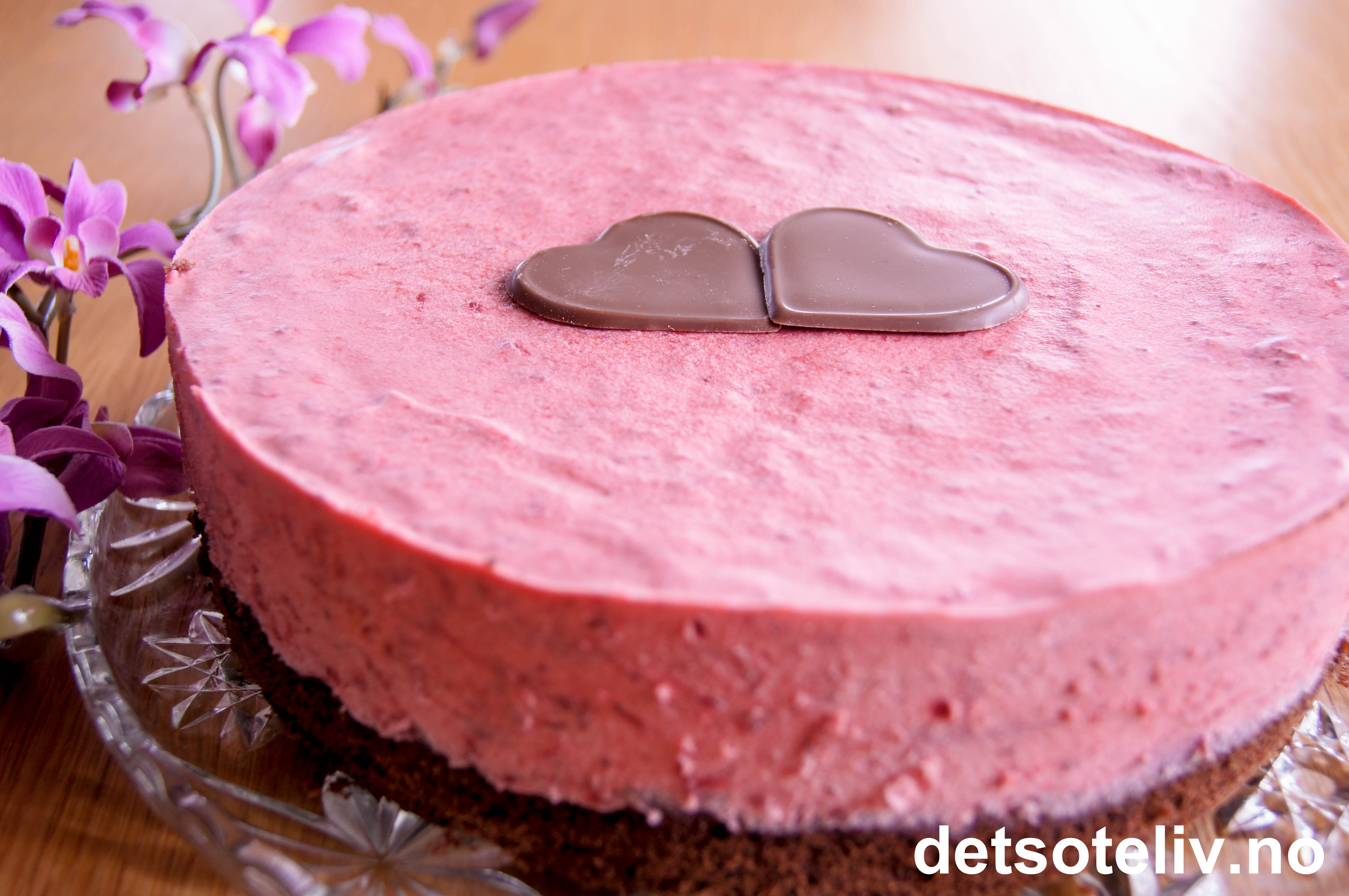 Dagen etter løsnes kaken forsiktig fra formen og flyttes over på et fat. Pynt med melkesjokoladehjerter, jordbær eller annen pynt du liker.