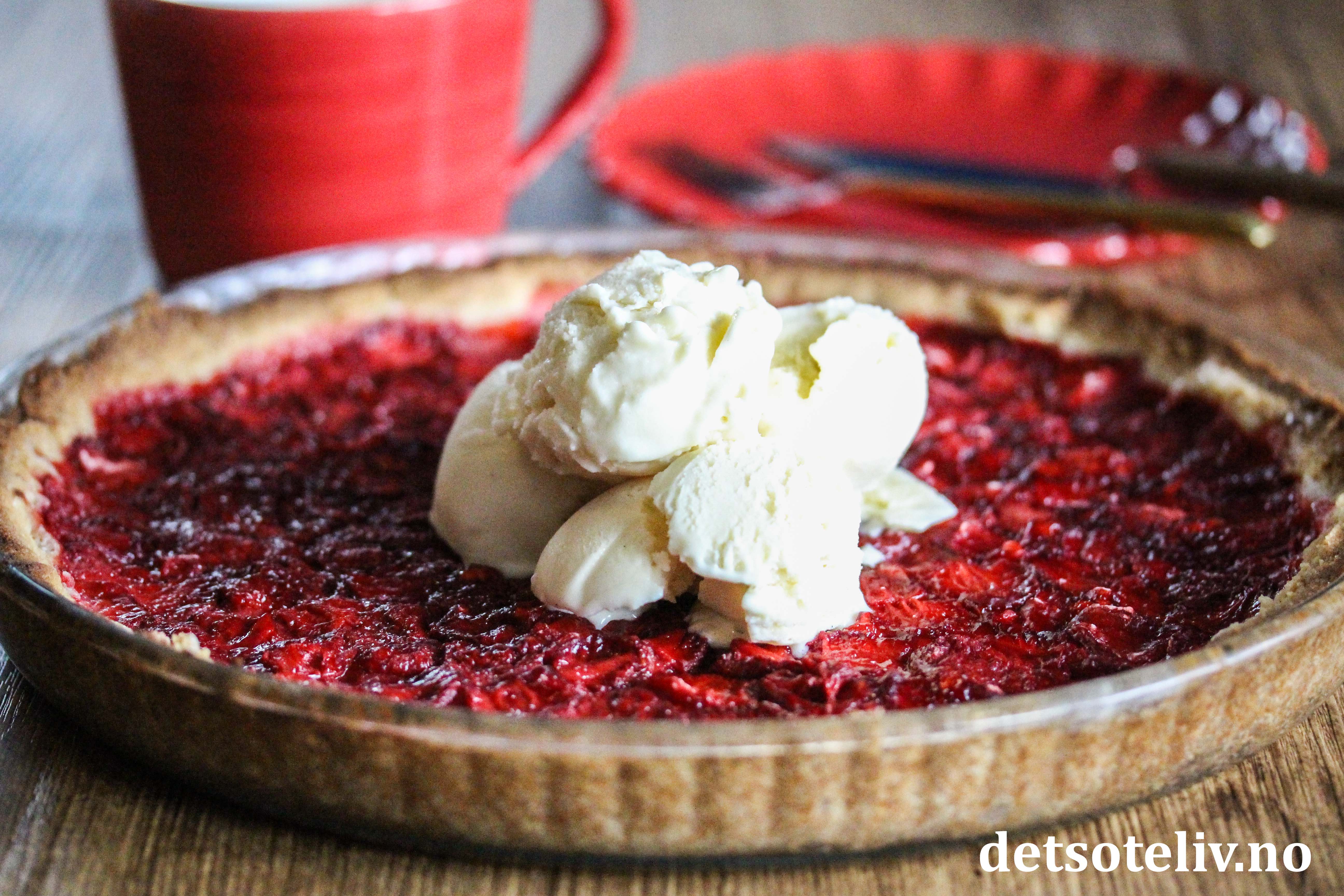 Merk at jordbærsaften kommer til å sive ut av jordbærene under steking. Fyllet vil derfor virke nokså rennende når du tar kaken ut av ovnen. Potetmelet gjør imidlertid at jordbærsaften tykner litt under avkjøling.