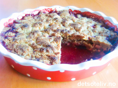 Ha jordbærene utover i en ildfast form (ca 24 cm i diameter). Smuldre over deigen.