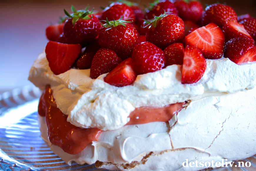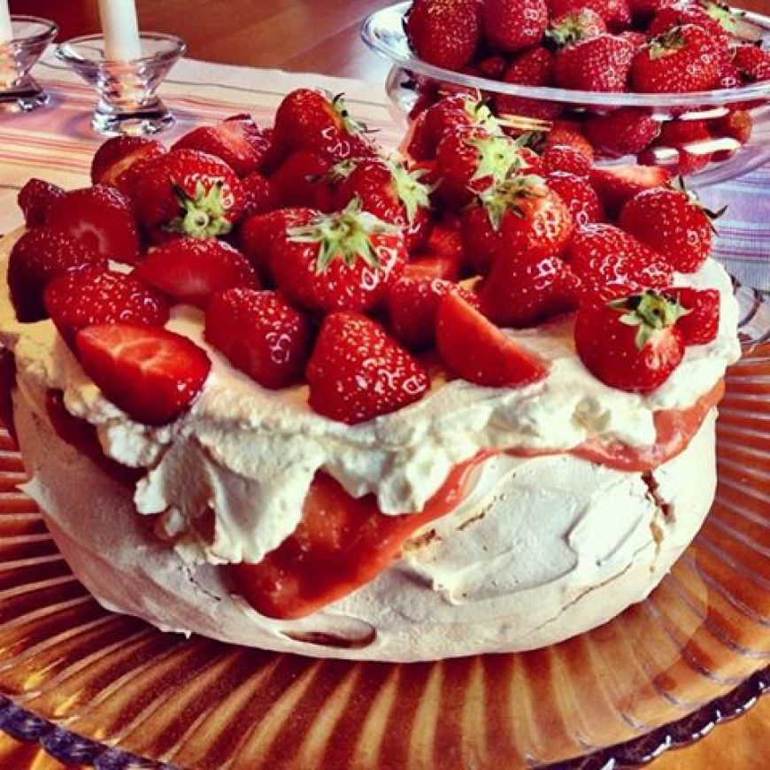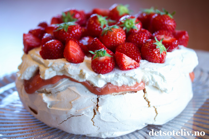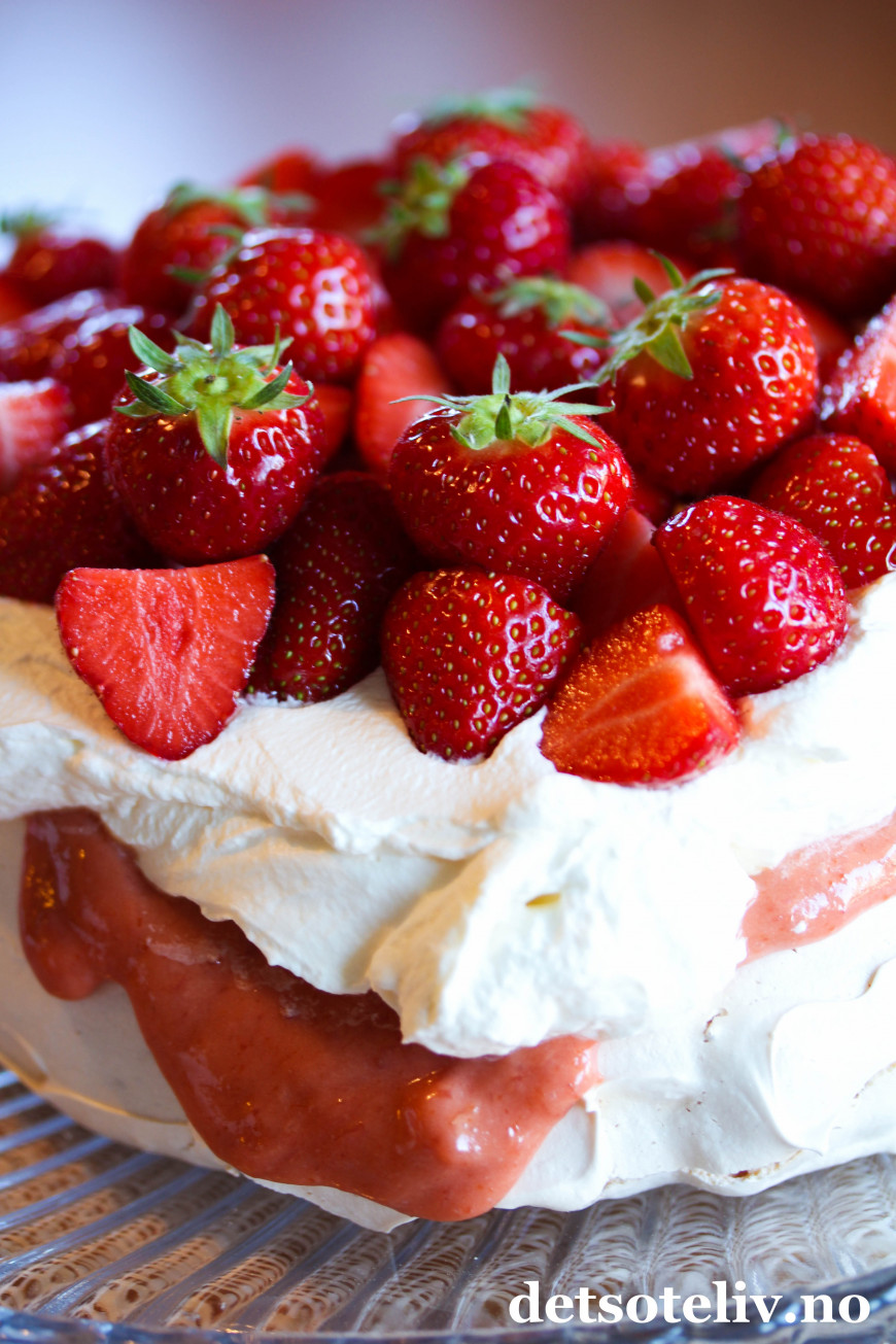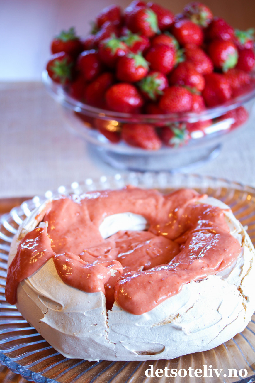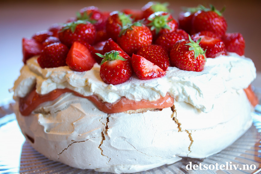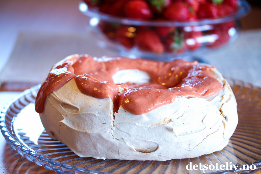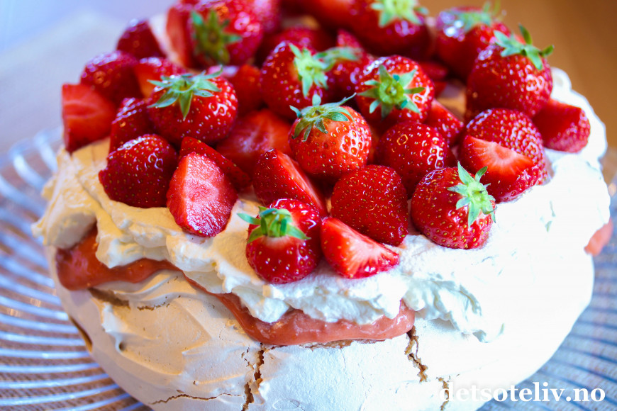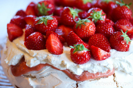 En klassisk Pavlova dekkes her med en nydelig "Jordbærcurd", som er et fornorsket navn på engelsk "Strawberry Curd".