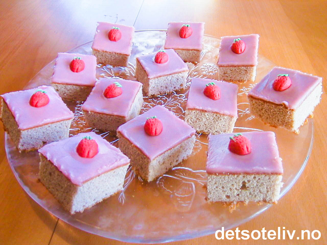 Marsipanjordbærene du ser på bildet er kjøpt på Panduro hobbybutikk. Får du ikke tak i dette kan du pynte kakestykkene med litt rosa kakestrøssel i stedet, eller sløyfe pynten helt.
