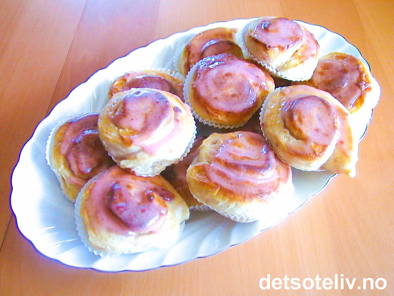 Bland melis, vann og jordbærsyltetøy til jevn, passe tykk glasur (se tips). Stryk glasuren over de lunkne bollene med en smørekniv. La bollene stå til de er helt kalde og glasuren har stivnet.