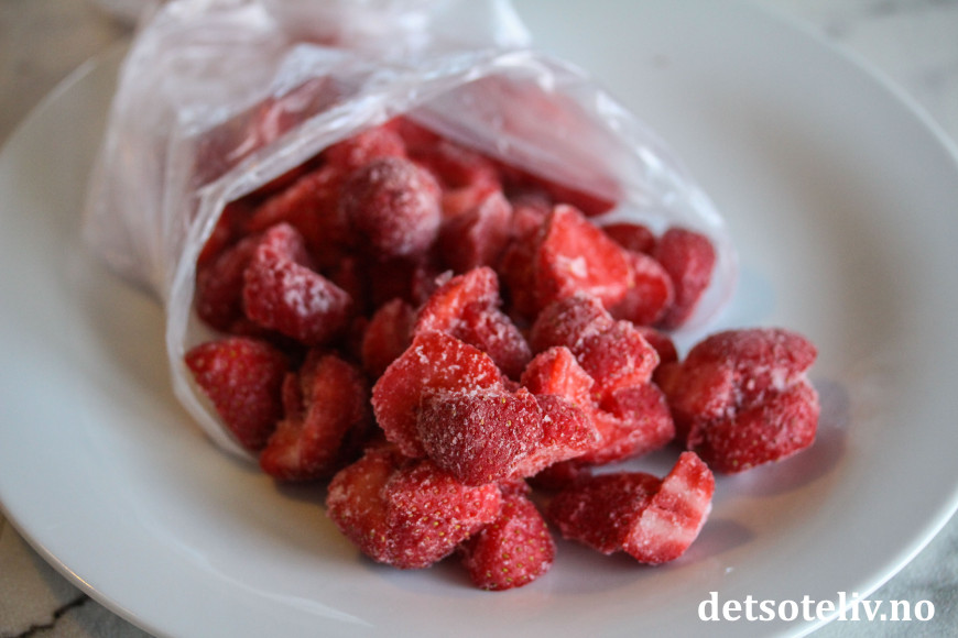 Rens jordbærene og del dem i mindre biter. Legg dem i en frysepose og frys dem over natten.