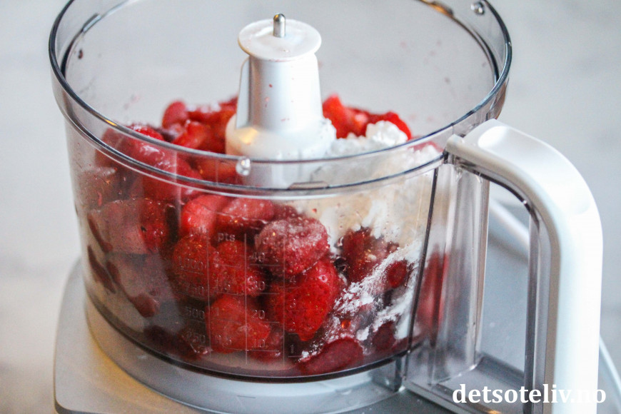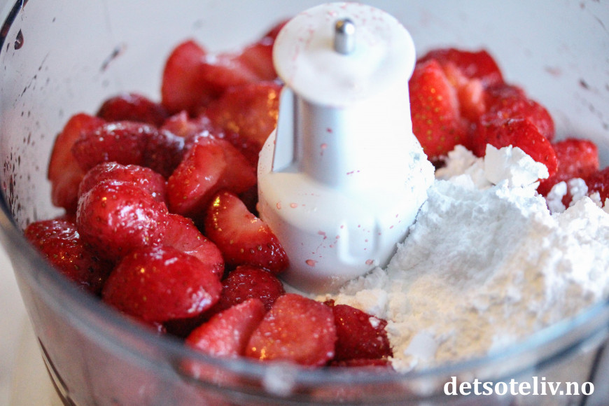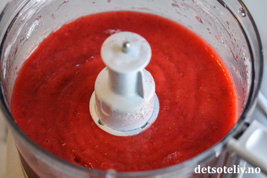Ha de frosne jordbærbitene i en food processor sammen med melis, vann og sitronsaft.