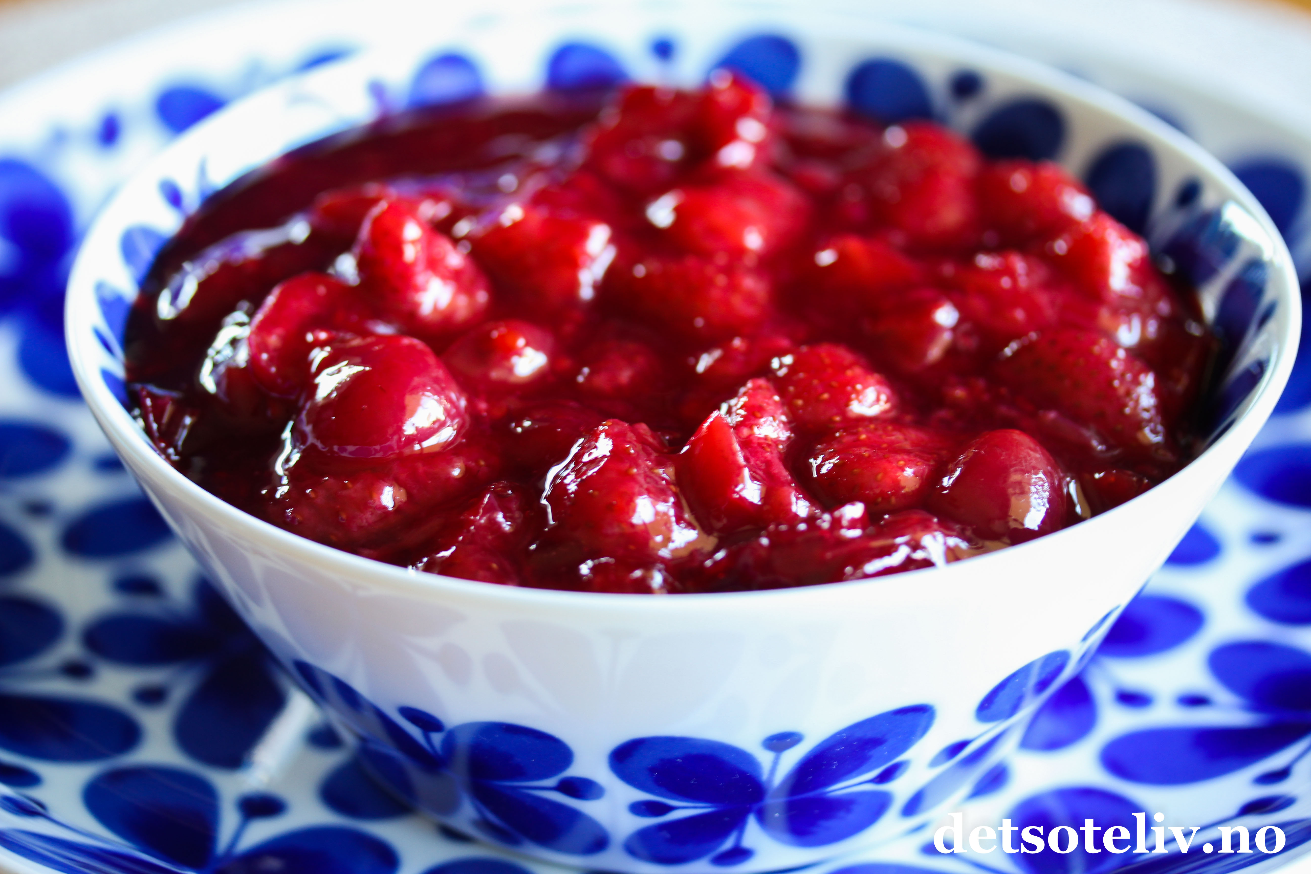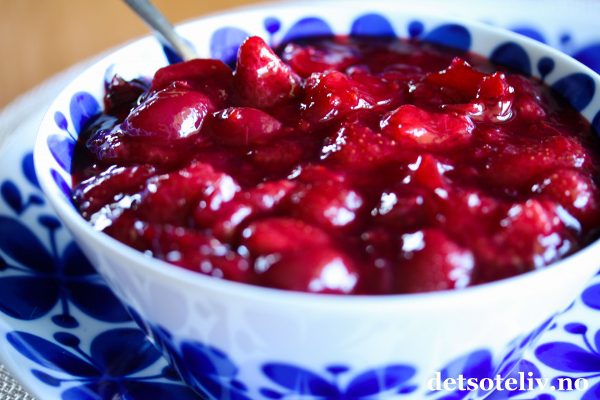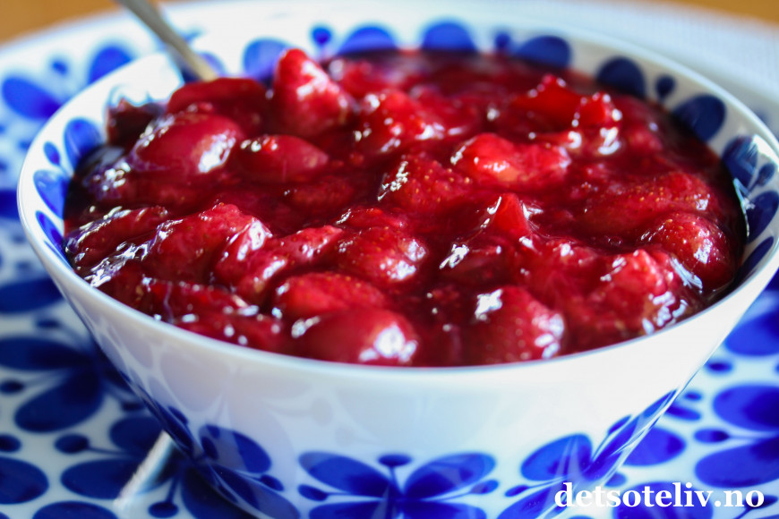 Dette syltetøyet er en herlig kombinasjon av røde jordbær, moreller og rips.