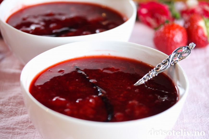 La blandingen stå i kjøleskapet i 1 time. Bærene vil da ha saftet seg noe.
