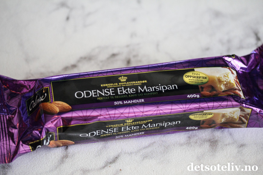 ♥ Jeg synes det er kjempelurt å kjevle ut både mørdeigen og marsipanen på plast (jeg bruker en stor plastpose som jeg klipper opp). Når deigen eller marsipanen er kjevlet ut stor nok, kan man bare ta tak i plasten og hvelve deigen eller marsipanen over formen og så dra av plasten.