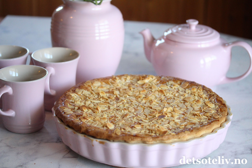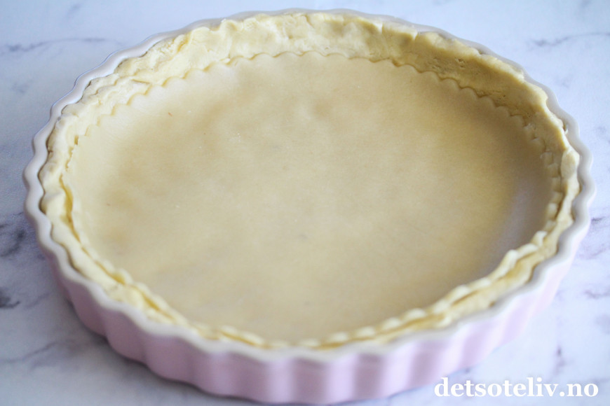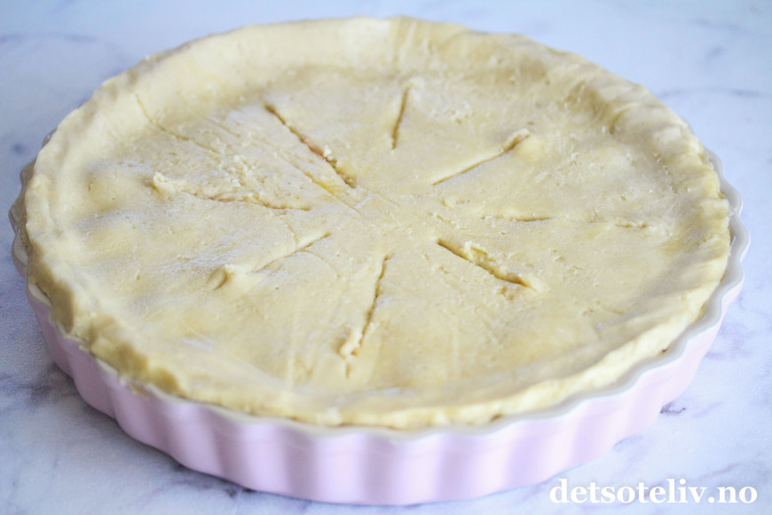 Finn frem en paiform/ildfastform som er 28-30 cm i diameter og 4-5 cm høy (formen jeg har brukt er som sagt fra Le Creuset). Spray den med formfett eller smør den med litt smør.