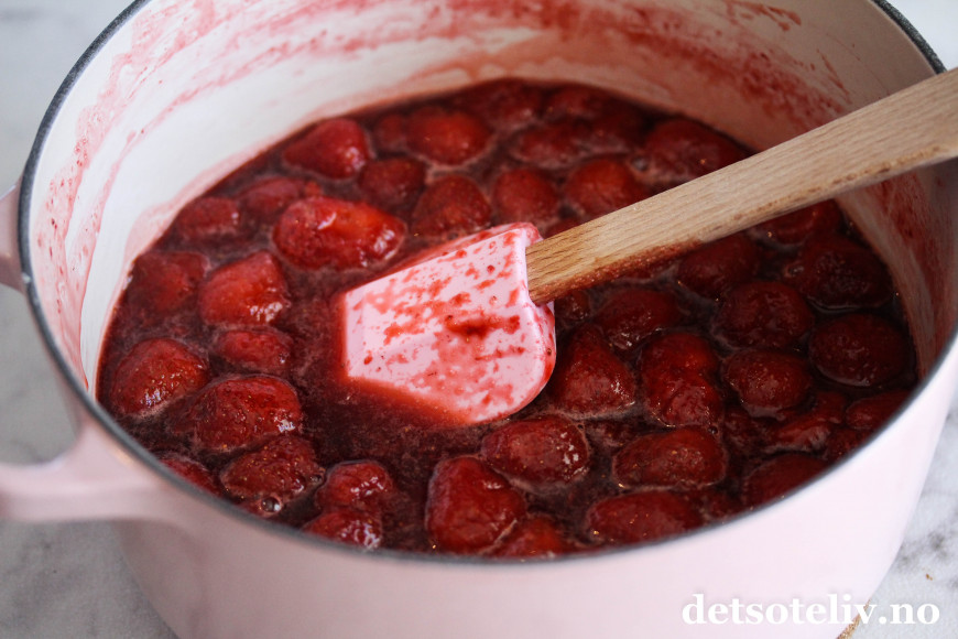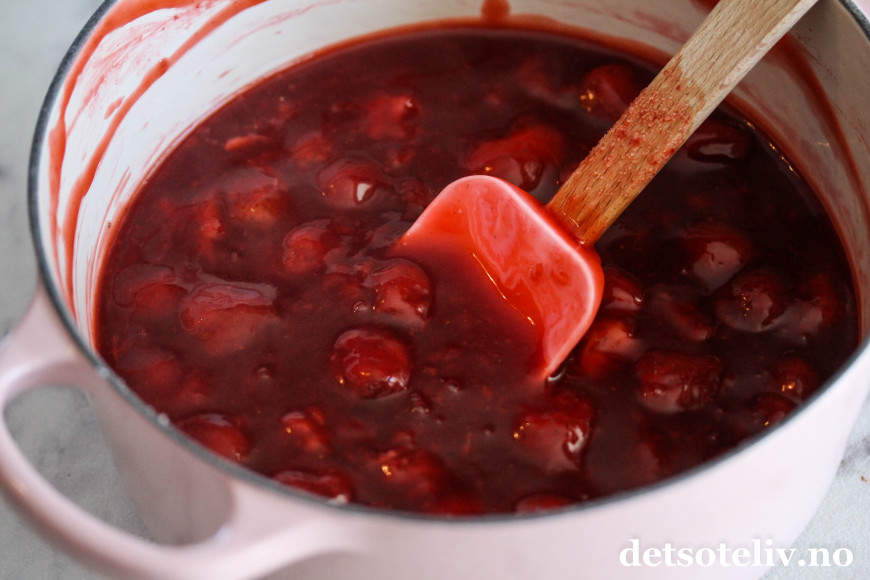 Sett så kjelen tilbake igjen på platen og gi blandingen et nytt oppkok mens du rører. Du vil da se at jordbærfyllet tykner. La jordbærfyllet småkoke i 2 minutter og husk å røre hele tiden så jordbærblandingen ikke svir seg. Ta kjelen av platen og avkjøl jordbærfyllet.