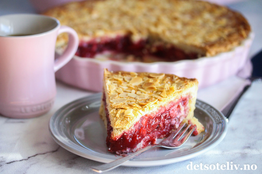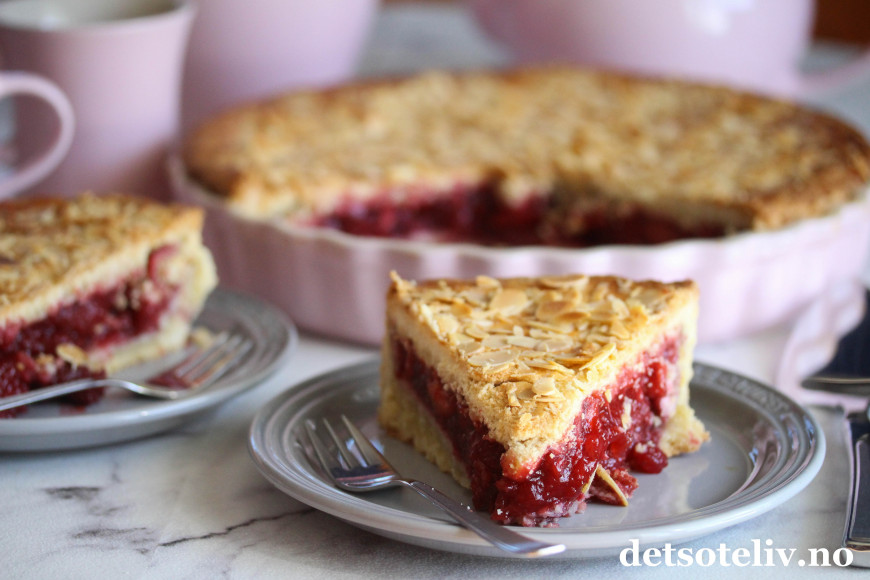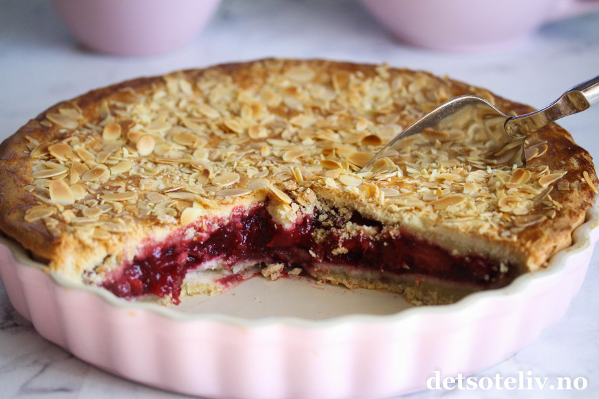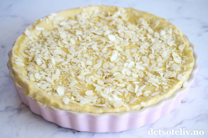 ♥ Ekte marsipan i bunnen av paien gir veldig god smak på paien og forhindrer dessuten at paibunnen blir bløt av kirsebærfyllet. Jeg kjevlet ut hele pakken med ekte marsipan som er på 400 gram (lilla rull fra Odense) for å ha litt å gå på, men skar bort ca 100 gram da jeg skjærte ut sirkelen.