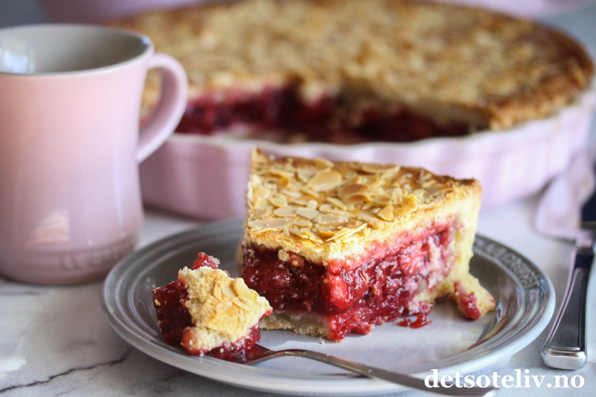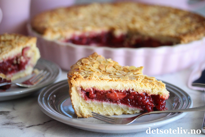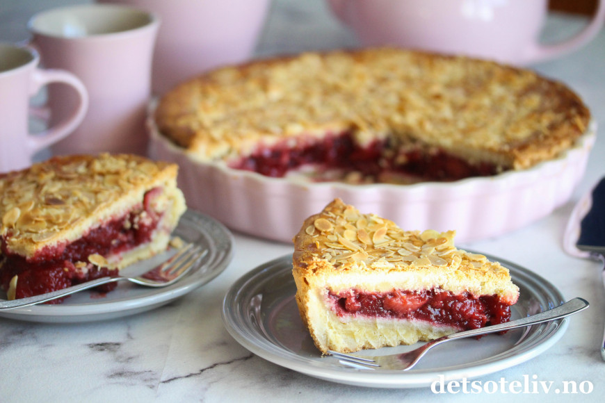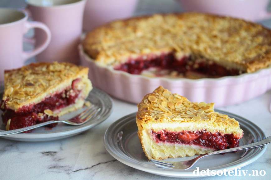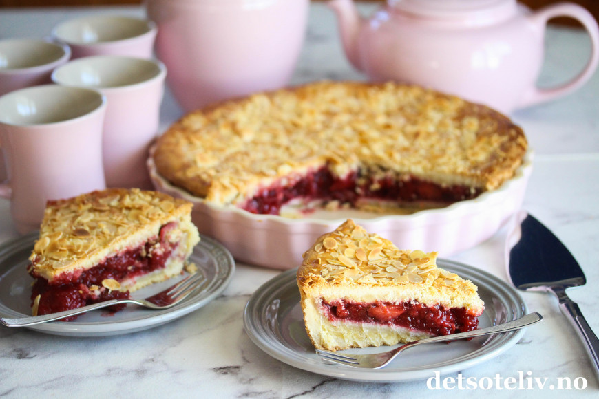 Terten lages med mørdeig, marsipan og masse, deilig jordbærfyll.