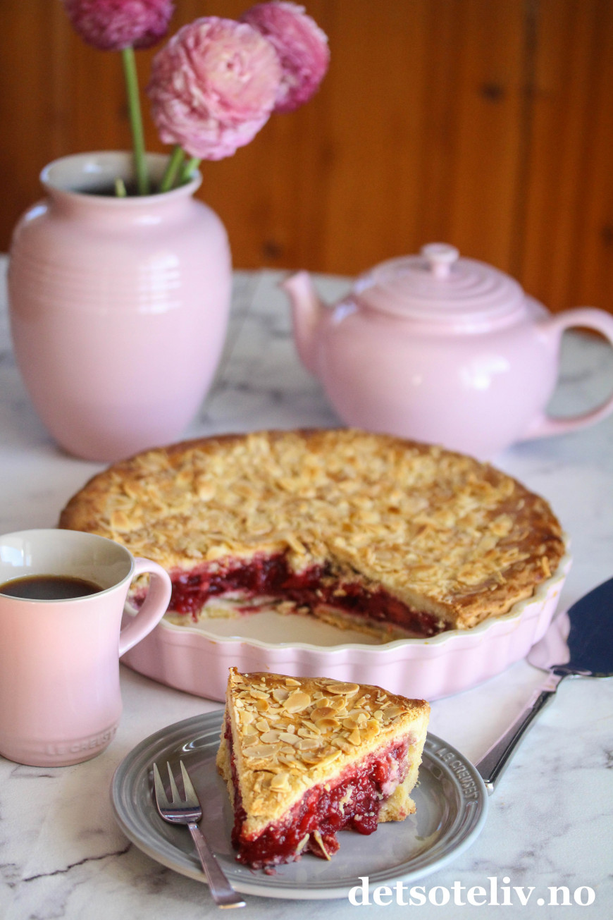 Den nydelige rosa terteformen som jeg har bruk til kaken, er fra den nye serien til Le Creuset i fargen "Chiffon Pink". Serien kommer i et utvalg produkter som sammen gir et vakkert og feminint kakebord. Passer også veldig fint i kombinasjon med andre farger, slik som fargen "Mist Grey" som jeg har på tallerkenene eller fargen "Creme".