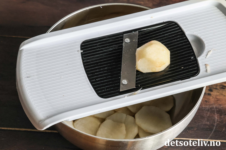 Skrell jordskokkene og skjær i tynne skiver. Dersom du har en mandolin, er denne super å bruke!