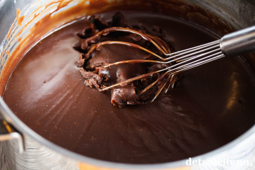Sikt hvetemel sammen med vaniljesukker, bakepulver og kakaopulver. Vend dette inn i deigen sammen med melken. Rør til deigen blir jevn og klumpfri.