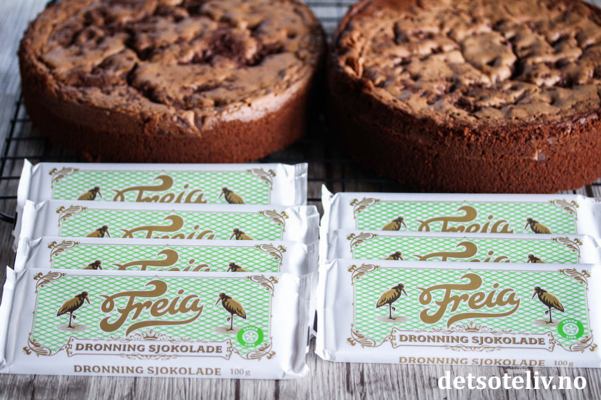 ♥ Det er Freia Dronning Sjokolade som gir den fantastiske sjokoladesmaken på denne jubileumskaken! Sjokoladen fås kjøpt i alle norske matbutikker!