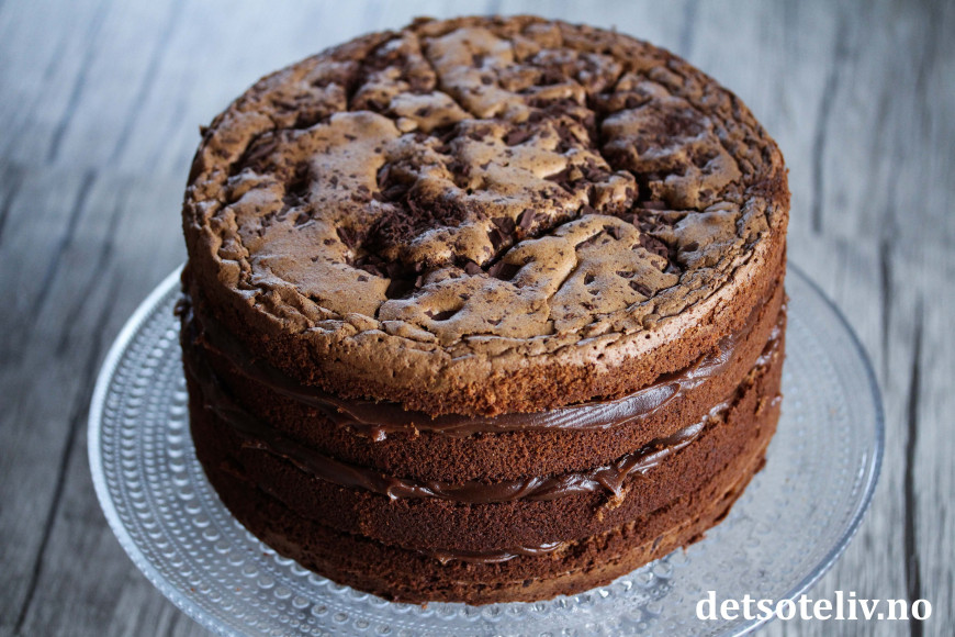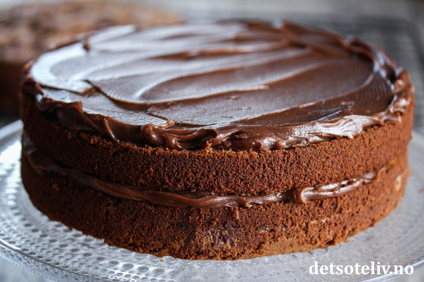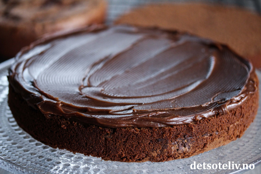 Legg på den andre kakebunnen og smør på et nytt lag sjokoladekrem.