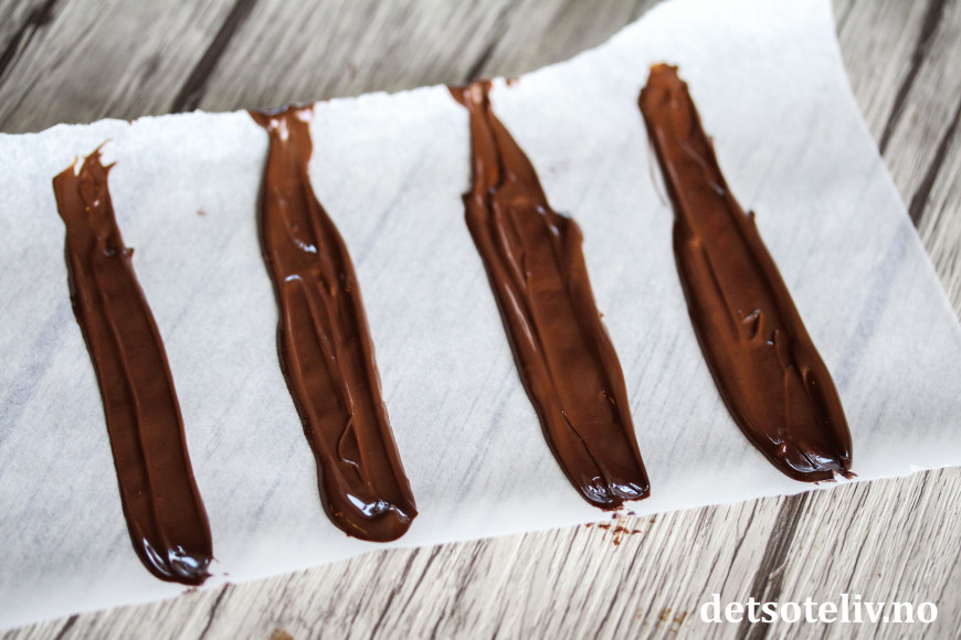 Lag noen brede remser av bakepapir og lag striper av smeltet sjokolade på bakepapiret ved hjelp av baksiden av en teskje.