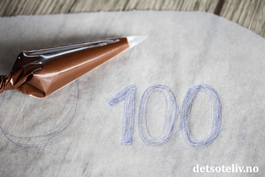 For å markere 100 års-jubileet, sprøytet jeg også ut tallet 100 i sjokolade. Dryss gjerne på gullfarget kakestrøssel før sjokoladen stivner, så fester det seg til sjokoladen. Deretter rister du av det overflødige strøsselet. Tilsvarende kan du selvfølgelig lage alle slags tall for å tilpasse det til jubileet du lager kaken til.