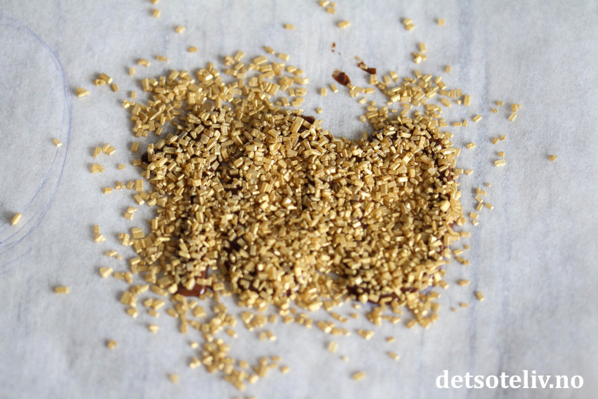 Dryss gjerne på gullfarget kakestrøssel før sjokoladen stivner, så fester det seg til sjokoladen.