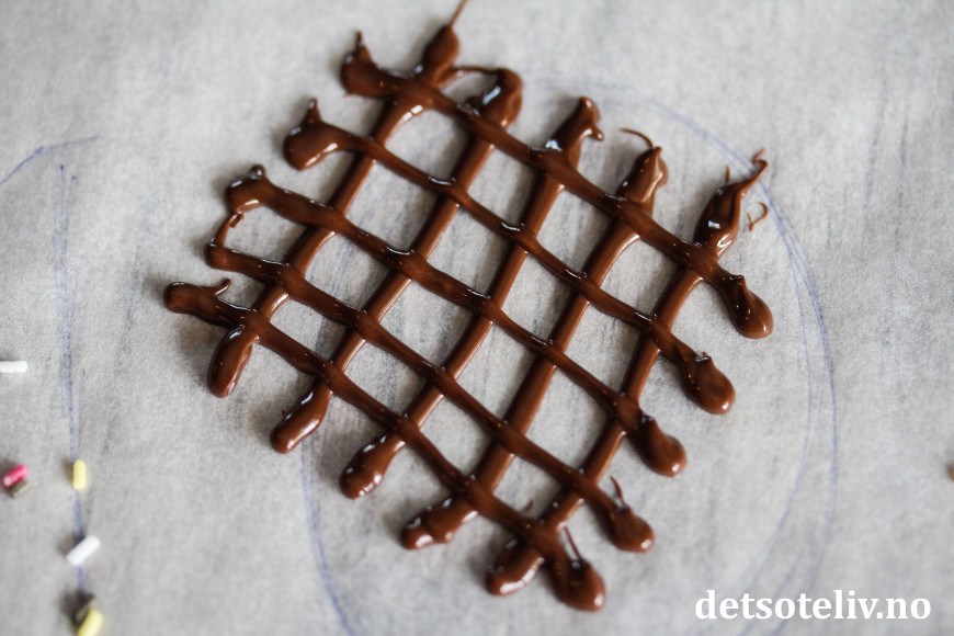 Du kan også lage annet mønster av den smeltede sjokoladen, f eks er det lekkert med et enkelt gittermønster. Bare ha den smeltede sjokoladen i en sprøytepose, klipp et lite hull, og sprøyt ønsket mønster på bakepapiret som deretter legges i kjøleskapet.