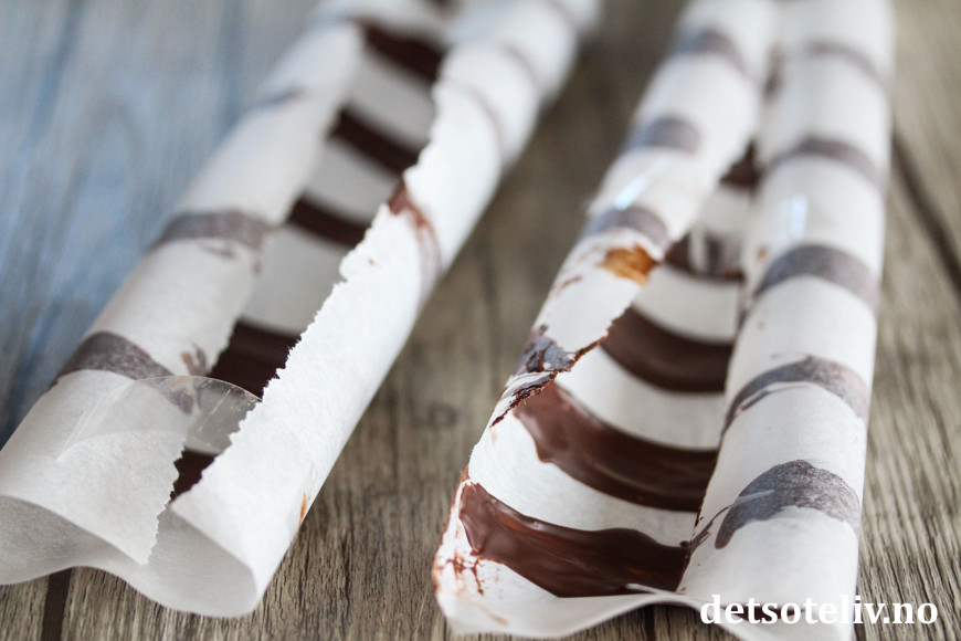 Lag noen brede remser av bakepapir og lag striper av smeltet sjokolade på bakepapiret ved hjelp av baksiden av en teskje. Ta tak i begge langsidene av bakepapiret og fest dem løst sammen med noen biter tape. Legg bakepapir-rullene i noe som kan støtte opp om den runde fasongen. Jeg la mine i flaskehyllen jeg har i kjøleskapet mitt. Har du en baguette-form, er den ypperlig egnet til dette. Det går også an å legge bakepapir-rullene på en fjøl, men du bør da ha en kraftig tape som holder bakepapiret på plass i en bøyd fasong. Sett i kjøleskapet i 30 minutter så sjokoladen stivner.