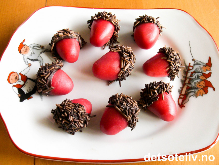 Marsipaneggene er ekstra enkle å lage hvis du kjøper ferdigfarget festmarsipan fra Odense (selges med rødfarget marsipan ved juletider). Alternativt kan du farge vanlig hvit marsipan med rød konditorfarge.
