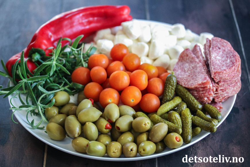 Mozzarellakuler, cherrytomater og oliven beholder du hele.