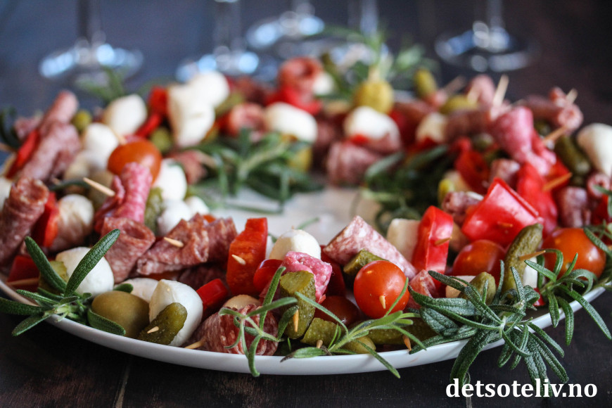 Tre de ulike ingrediensene på cocktailpinner slik at du får små spyd (du trenger ikke å ha alle ingrediensene på hver pinne).