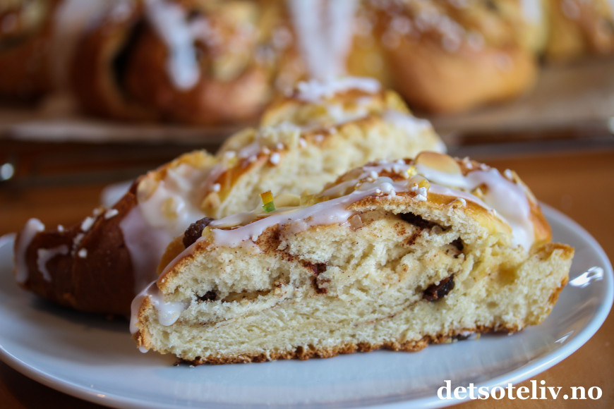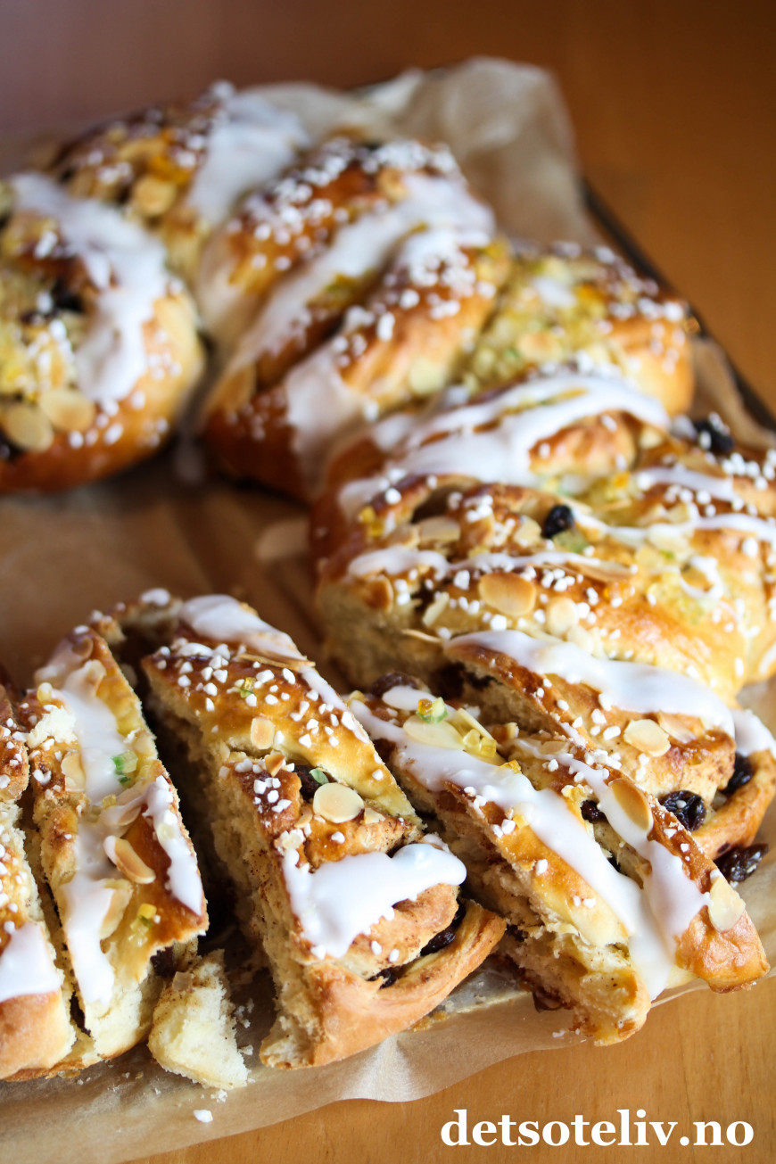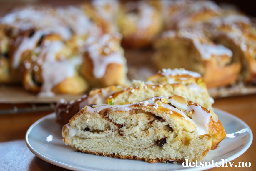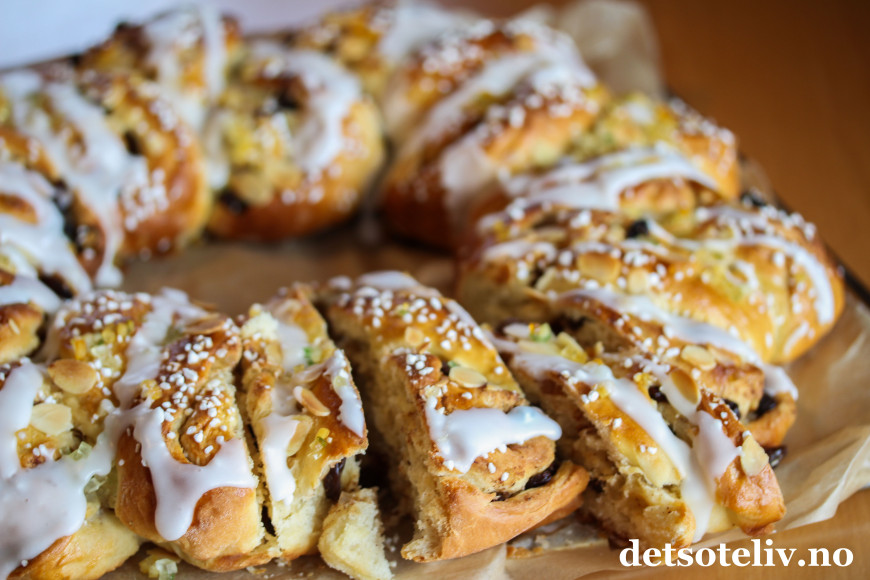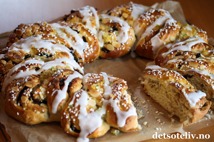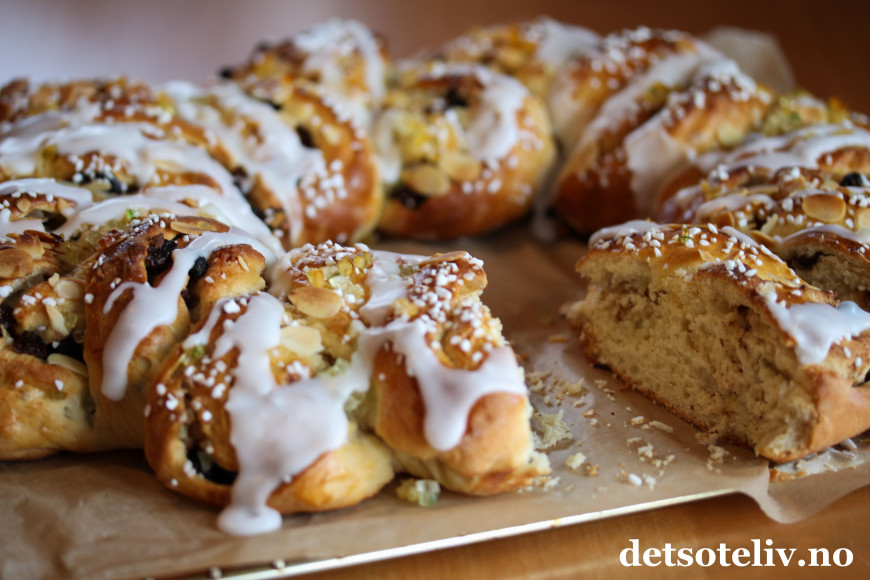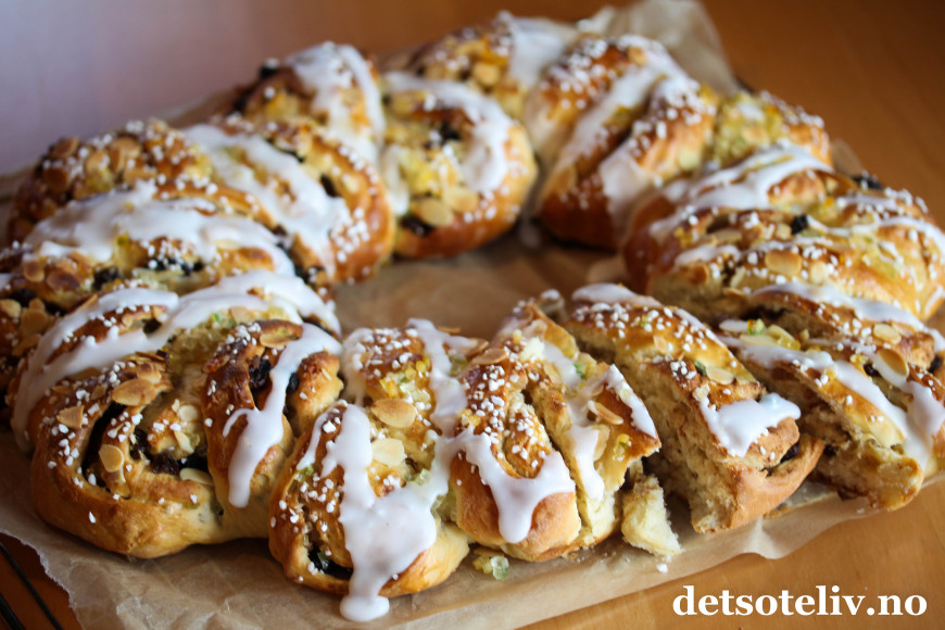 ♥ Kransen på bildet er pyntet med perlesukker som holder seg hvitt gjennom steking. Perlesukkeret finnes i svenske matbutikker, men jeg har dessverre foreløpig ikke sett det i norske (men hører rykter om at Coop Extra muligens har produktet..).