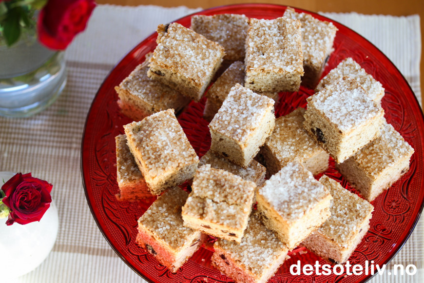 Ha deigen i en liten, bakepapirkledd langpanne (ca 20x30 cm). Dryss over perlesukker.