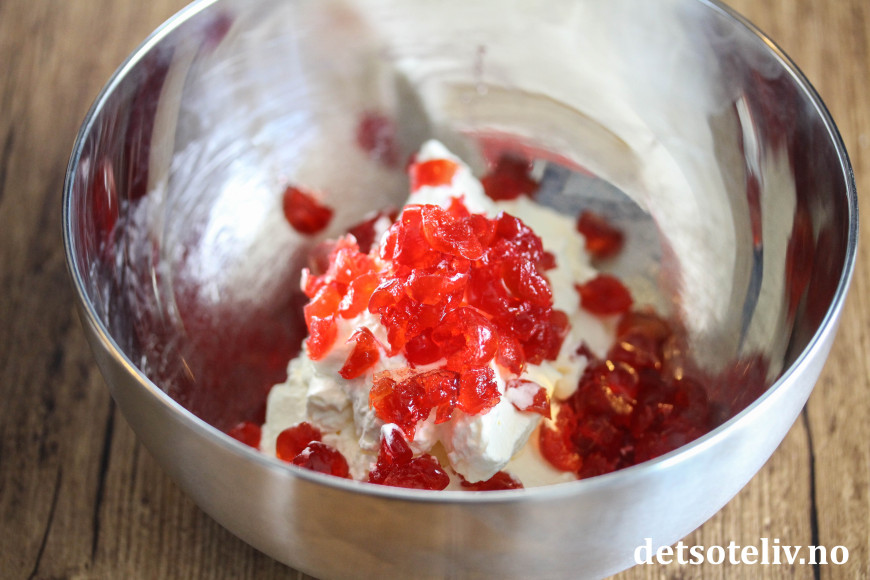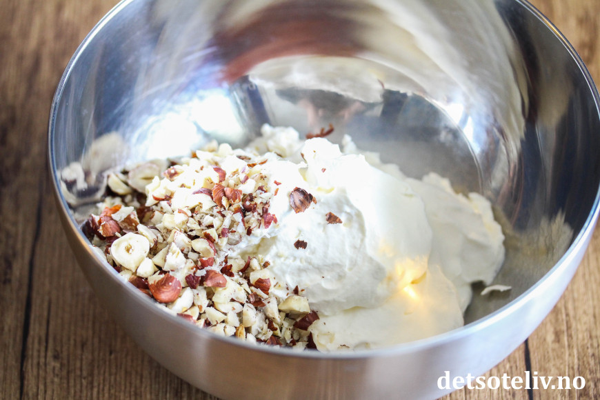Bland hakkede hasselnøtter i den ene delen (spar littegrann til pynt) og 100 g hakkede cocktailbær i den andre delen.