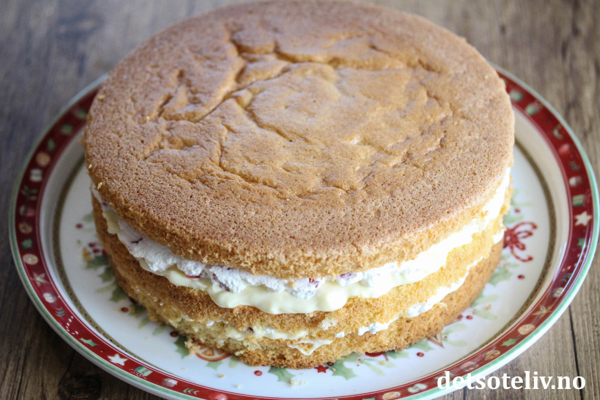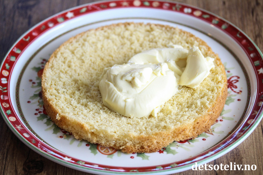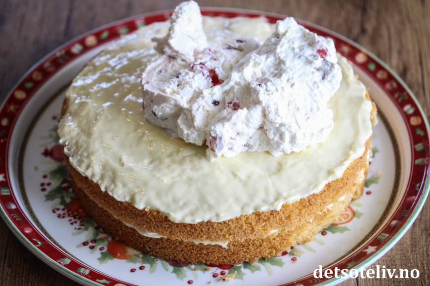 Legg på den andre kakebunnen. Smør på resten av vaniljekremen.