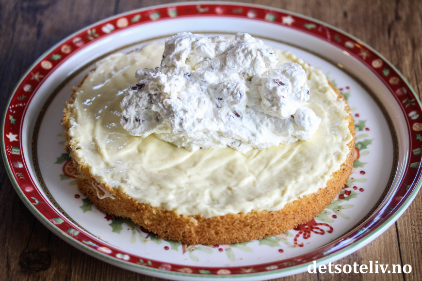 Legg den nederste kakebunnen på et fat. Smør på halvparten av vaniljekremen.